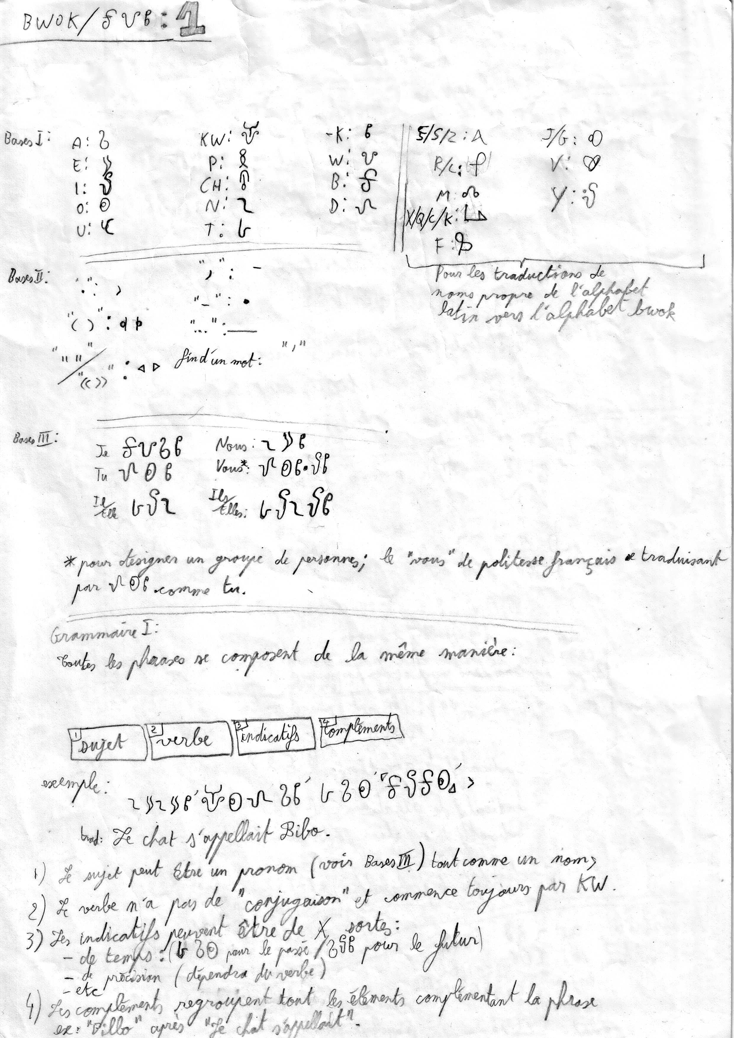 Petit détail à noter concernant le w: dans l'écriture Bwok le w correspond à "ou-o" (voir prochain scan) , mais cependant si l'on écrivait "bwk" au lieu de "bwok", on perdrait en clarté, c'est pourquoi un o se greffe au w dans l'écriture latine du Bwok alors que la retranscription directe ne le ferais pas, sauf en cas de "a" suivant un "w" où le "o" supplémentaire disparait (à nouveau, voir prochain scan pour comprendre pourquoi).